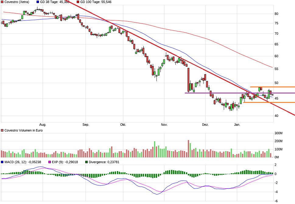 Zusätzlich spielen natürlich auch die mittel- und langfristigen Charts eine Rolle - schon deshalb weil natürlich auch mir bekannt ist, dass viele (und auch die Algos) darauf setzen. Hier habe ich derzeit die Hoffnung, dass bei Covestro um die 42 Euro eine Bodenbildung stattgefunden hat und (entsprechender Gesamtmarkt vorausgesetzt) nach einigem hin und her der Weg nach oben wieder angetreten wird.