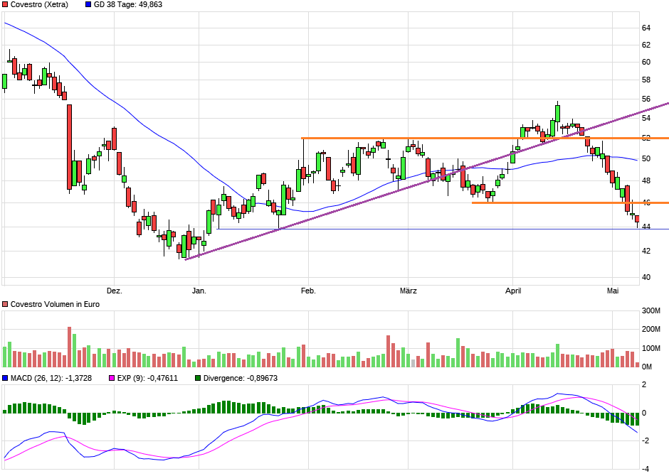 Wenn man bedenkt, dass nun die Q1-Zahlen nochmal schlechter waren als ich ohnehin schon befürchtet hatte, dann geh ich umso mehr davon aus, dass die Tiefs bei 41-42 € getestet werden. Das hat auch nur am Rande etwas mit dem Gesamtmarkt zu tun. Covestro hat einfach sehr schlechte Zahlen veröffentlicht. Und wenn man bedenkt, dass die Konjunktur eigentlich noch halbwegs stabil aussieht, fragt sich der Markt sicher nicht unbegründet, was mit den Margen passiert, wenn die Konjunktur mal etwas stärker schwächelt. Insofern hat der Gesamtmarkt in Form von Sorgen wegen des Handelskonflikts vielleicht doch was mit dem Kurs zu tun.