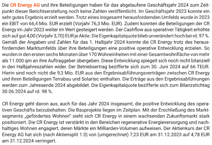 Das Zitat ist richtig. Ich investiere nicht übermäßig in die CR Energy AG, sondern in ihre Muttergesellschaft, die MPH Health Care AG, von der aich m 28. Mai (Annual Report 2024) Auskunft über ihren Anteil an CR Energy AG erwarte. Die Aktie der MPH Health Care AG hat gleich zwei Eisen im Feuer und ist ebenfalls grotesk unterbewertet, sogar noch wunderlicher und seltsamer unterbewertet als CR Energy.