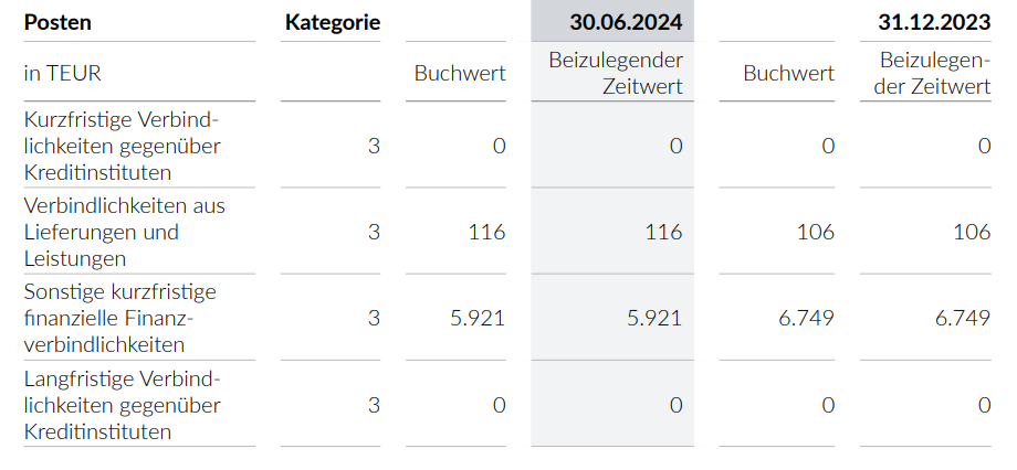 Kurzfristige finanzielle Verbindlichkeiten 30.06.2024: rd. €6 Mio. (siehe angehängte Grafik)