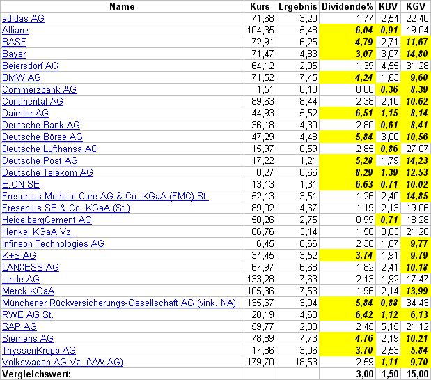 beigefügt mal eine Liste mit den Dividendenrenditen, KBV und KGV im DAX. Viele DAX-Titel haben an der Börse sogar einen geringeren Kurs als Eigenkapital in den Büchern steht, obwohl die Unternehmen Gewinne machen.