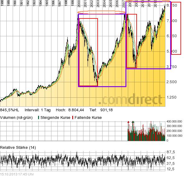Wenn man den DAX schon mit 2000 und/oder 2007 vergleicht, dann muss man auch feststellen, dass eine Übertreibung mitunter recht lange dauern kann.