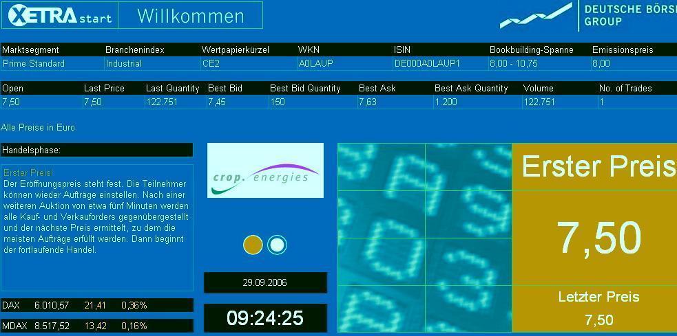 Angeboten werden bis zu 25 Millionen Stammaktien, die aus einer Kapitalerhöhung gegen Bareinlagen stammen. Diese solle voraussichtlich am 27. September 2006 von einer außerordentlichen Hauptversammlung der CropEnergies AG beschlossen werden. 'Die Aktien sind mit voller Gewinnanteilberechtigung ab dem 3. Mai 2006, dem Tag der Gründung der Gesellschaft, ausgestattet', hieß es am Sonntag weiter. Darüber hinaus können bis zu 3 Mio. Aktien aus dem Eigentum der Südzucker AG zugeteilt werden.
