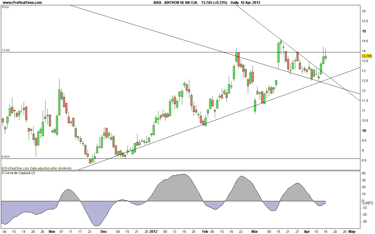 Auf mittelfristige Sicht haben wir nach 1-2-3 einen Abwärtstrend generiert, der immer noch nicht gebrochen ist. Der Spielraum für die Aktie ist denkbar gering. Sie muss 18,065 übertreffen um einen neuen Trend aufbauen zu können. Der Bruch würde Käufer nach sich ziehen. Unterstützung bietet das Tief von gestern bei 17,305. Darunter gehört auch der Stop hin.