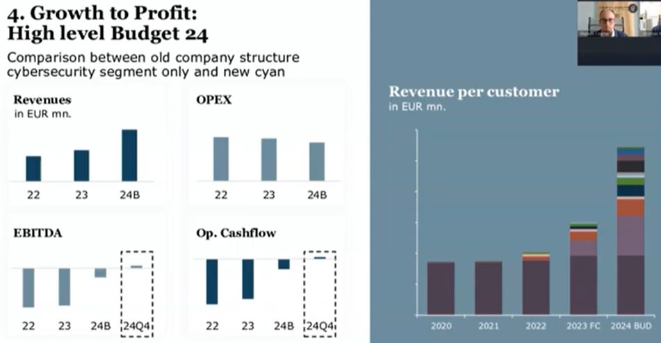 München, 23. Mai 2024 – Die cyan AG, ein Anbieter von intelligenten Cybersecurity-Lösungen, hat heute den Geschäftsbericht für das Jahr 2023 veröffentlicht und bestätigt die vorläufigen Zahlen. Der Umsatz im fortgeführten Geschäftsbereich (Segment Cybersecurity) wuchs um 23 % auf EUR 4,7 Mio. (2022: EUR 3,8 Mio.). Dabei stiegen die wiederkehrenden Umsätze besonders stark um 41 % auf EUR 4,4 Mio. Das operative Ergebnis EBITDA erreichte wie erwartet EUR -4,5 Mio. (2022: EUR -4,4 Mio.). Die Geschäftszahlen sind geprägt von der erfolgreichen strategischen Neuausrichtung der Gesellschaft. Zum Jahresende 2023 wurde das BSS/OSS-Geschäfts veräußert, das rund 45 % des Umsatzes beisteuerte, aber für 60 % der operativen Kosten verantwortlich war. cyan fokussiert sich seitdem auf das Kerngeschäft Cybersecurity.