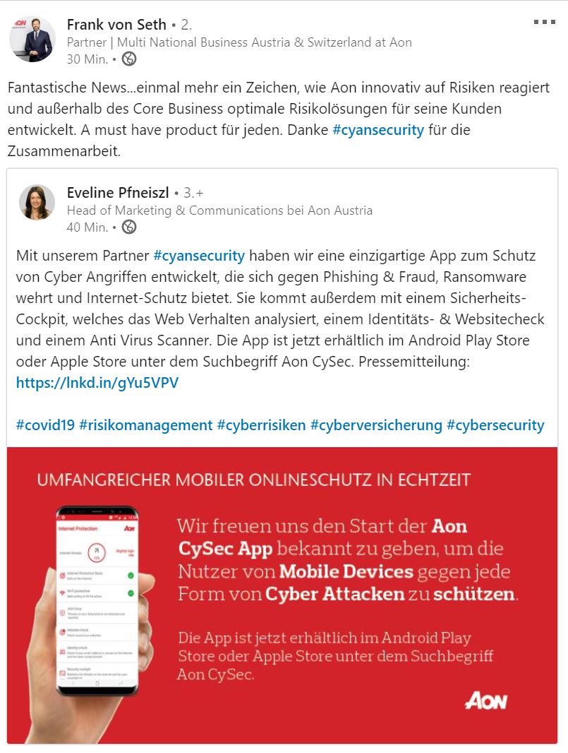 Als einer der weltweit größten Risikoberater und Versicherungsmakler reagiert Aon auf die rasante Entwicklung von Cyber-Risiken mit einem neuen, exklusiven Sicherheitspaket. Aon bringt zusammen mit cyan eine Security-Applikation für Android und iOS-Geräte in die App Shops. Die neue Aon Security-Applikation ermöglicht dem Nutzer Onlineschutz in Echtzeit und bekämpft proaktiv Cybergefahren. Die Akkuleistung und der Arbeitsspeicher der Devices werden dabei in keiner Weise belastet. Die Kooperationspartner platzieren die Aon CySec - App kostengünstig in den großen, bekannten App-Shops Android Play Store und iOS Store. Die App ist im Aon Corporate Design gestaltet und überzeugt als attraktives Angebot mit zusätzlichen Sicherheitsfeatures wie Identitäts- oder Website-Checks.