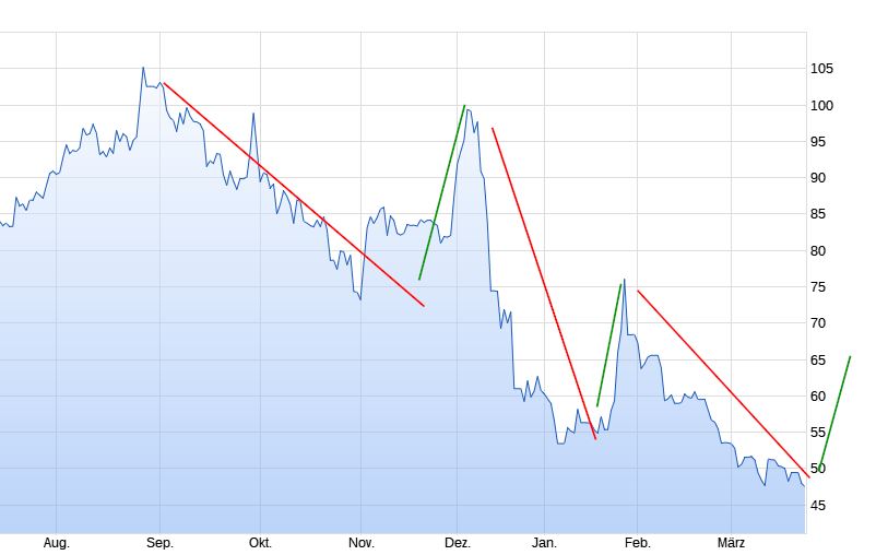 Zu meinen, man malt ein paar Striche und kann damit jetzt Wissen, wann die Aktie um 50% steigt ist schon ein Witz. Daher erstmal lernen, was Charttechnik ausmacht und da ist es nicht mit Strichen getan.