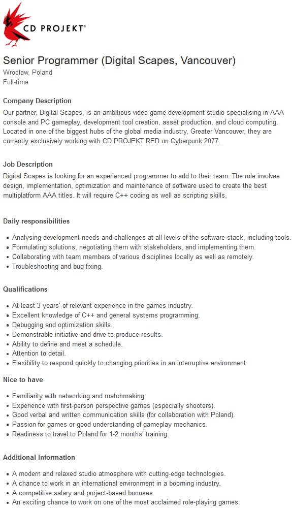 Digital Scapes is looking for an experienced programmer to add to their team. The role involves design, implementation, optimization and maintenance of software used to create the best multiplatform AAA titles. It will require C++ coding as well as scripting skills.