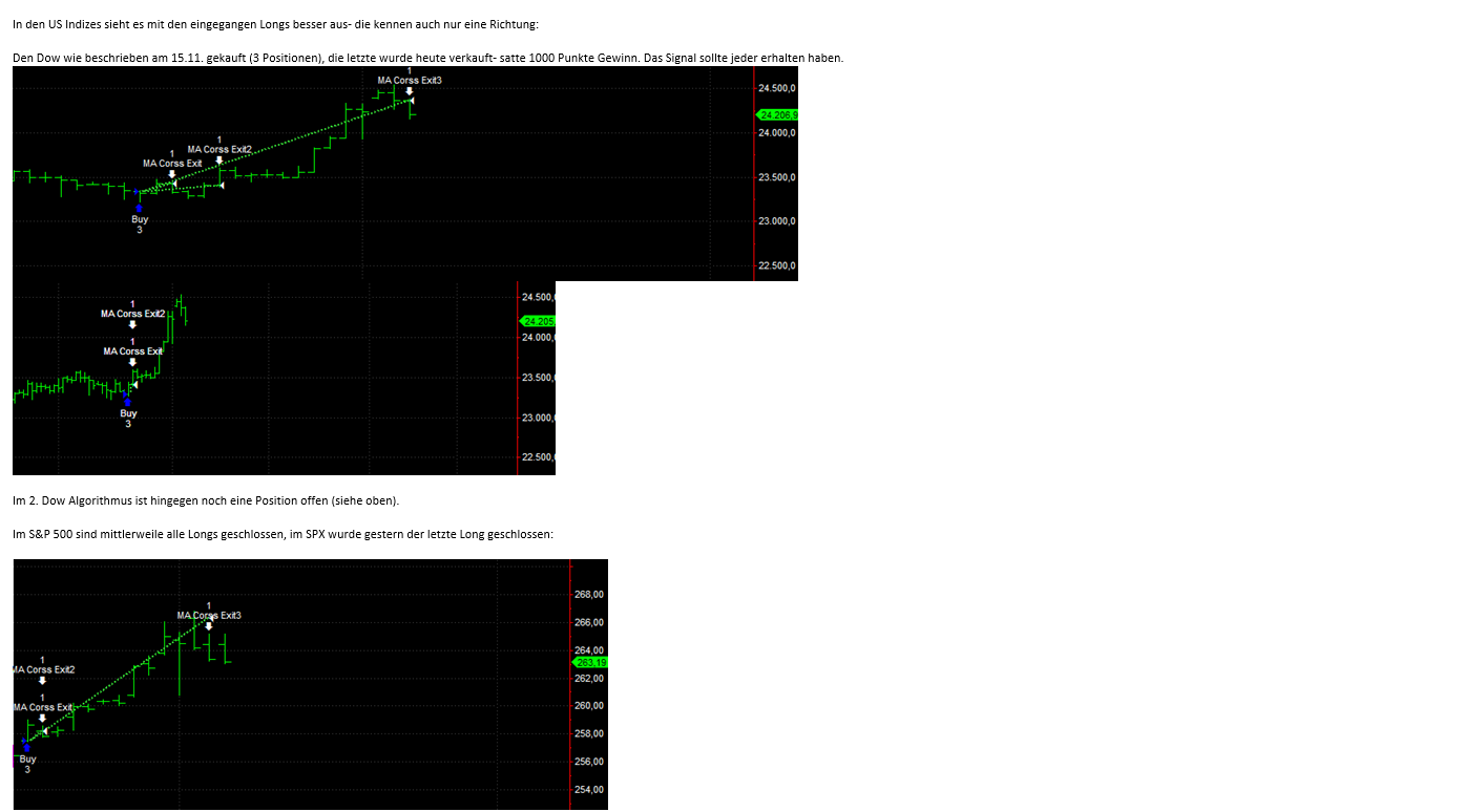 Es wurden jeweils 3 Longpositionen zu Kursen von 13080 und 13131 eingegangen. Jeweils eine Position wurde bereits zu 13060 und damit mit leichtem Verlust geschlossen, die anderen 4 Positionen sind Stand jetzt alle im Plus; wer die 2 Positionen noch nicht geschlossen hat kann entweder morgen mit Gewinn verkaufen oder alternativ auf die weiteren Exit Signale warten!
