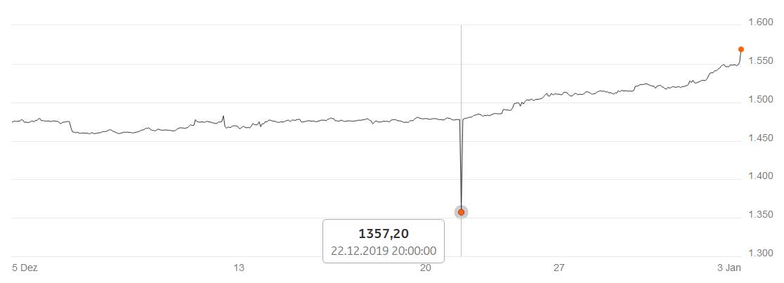 Nadelmuster Goldkurs : Den die Kursnadel am 22.12. 20:00 nach unten konnte ich nirgends verifizieren. Es ist kaum möglich, für den Goldkurs außer intraday wirklich minutengenaue Zahlen zu kriegen. Das Nadelmuster nach oben, 4 mal jeweils am Wochendende den Dezember über, und am 31./1., also Zeiten, wo zumindest in Europa nicht gehandelt wird, hatte sich fortgesetzt. Unter dem Eindruck eines für Insider vorhersehbaren enormen Kursanstiegs kriegt das Ganze noch mal eine andere Bedeutung. Was da genau gelaufen ist, habe ich keinen Plan, aber normale Kursschwankungen waren das wohl nicht.