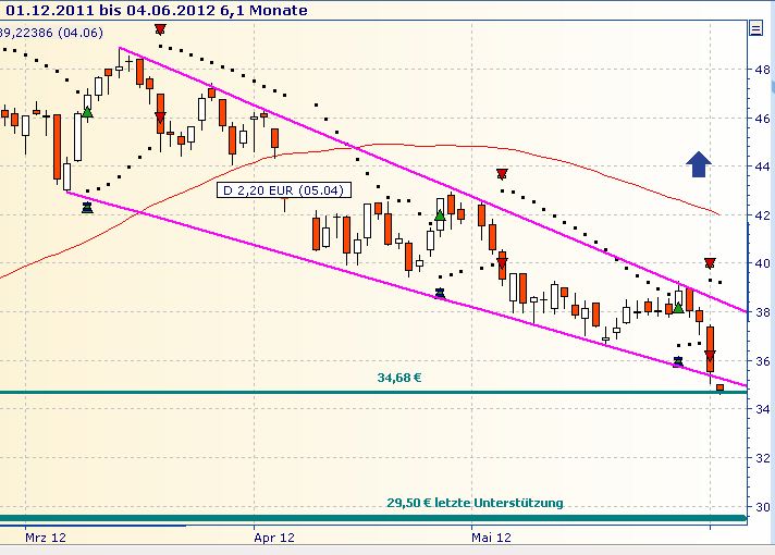 Würde ich eine persönliche Wette mit einem Kumpel eingehen, dann wäre meine Ansage 30,50 bis zum 15ten Juli mindestens einmal gesehen zu haben. Diesen Wert werden die Jungs auf jeden Fall spielen, denn es ist das erste markante Rücklaufziel für die Bären, Überschuss Plus / Minus 2 %. Kommen weitere Anzeichen für eineAbschwächung der Automärkte auf oder die gesamte Wirtschaft trübt sich ein, dann würde mich auch 28,50 nicht wirklich überraschen. Ich kann nur eines sagen: Die Auftragseingänge werden jeden Tag weniger und der NFZ Bereich geht noch stärker zurück als gedacht.