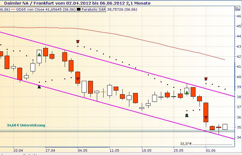 eigentlich sieht da gar nichts gut aus bei Daimler. Seit 5920 und bis auf 6095 hat sich Daimler in einer Range zwischen 34,40 und 35,30 bewegt. Also der ganz große Wurf ist das nicht gerade. Der Dax könnte bis 6150 laufen und dann wieder umdrehen. Kommt Daimler dann unter die Räder geht es straight auf die Ziele die schon mehrfach genannat wurden. Also auch mit einem Call war innerhalb der machbaren 30 Cent von heute ja nicht wirklich was drin.