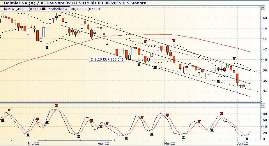 eines sollte glasklar sein, der heutige Anstieg an das Ziel 6220 ist regelkonform und bestätigt den Abwärtstrend. Wer einige Monate hier zurückblickt der weiß noch wie es war als der Aufwärtstrend begann. Auch da mussten Rückschritte zurück auf 5670 und 5850 in Kauf genommen werden um den Aufwärtstrend zu bestätigen. Daimler wird fallen und es gibt nichts was daran vorbei führt. Es wurde längst ein starkes Verkaufssignal generiert und das führt unweigerlich auf 30,90 zurück. Ich habe das in den letzten 10 Jahren Dutzende Male erlebt. Im Bereich der 2011 Tiefs wird sich zeigen ob von vort aus eine Trendwende ansteht oder nicht. Heute war es bei Daimler erneut ein weiteres Zeichen von Schwäche, denn alle Tagesgewinne wurden wieder abverkauft. Dieser Modus operandi ist derart typisch für die Aktie, es ist fast schon wie ein Strickmuster.
