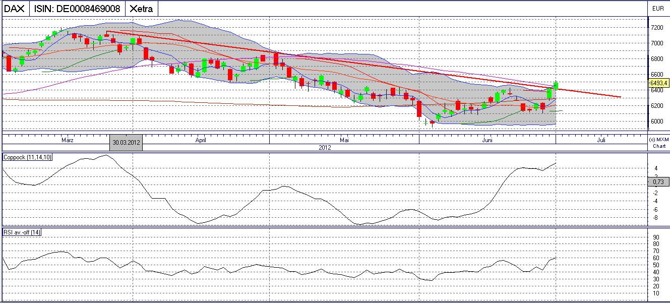 dass die Regeln der Technik im Bezug auf den Dax Bestand haben und die sagt aus, dass bei 6430 ein ganz gewaltiger Widerstand aus mehreren Linien verläuft. Es müsste morgen schon genauso gut gelaunt weiter gehen wie am Freitag damit dieser durchbrochen wird. Wenn ich es nicht ohnehin schon getan hätte, dann würde ich wetten dass es morgen direkt nach unten geht. Aber das ist nur meine bescheidene Meinung aus dem Bauch heraus. Es gibt auch andere die sagen wenn die Skepsis am größten ist geht es meistens nach oben.