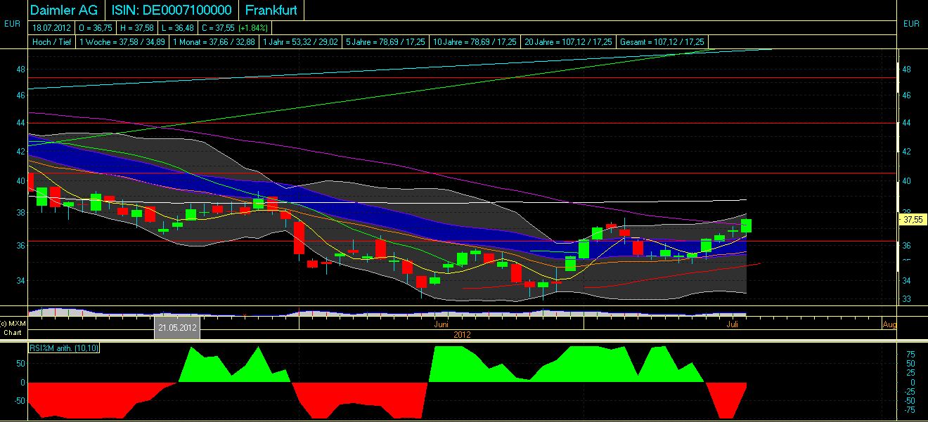 Daimler könnte locker auf die 39 € zumarschieren, aber genau so schnell wieder Richtung 35,50 €.