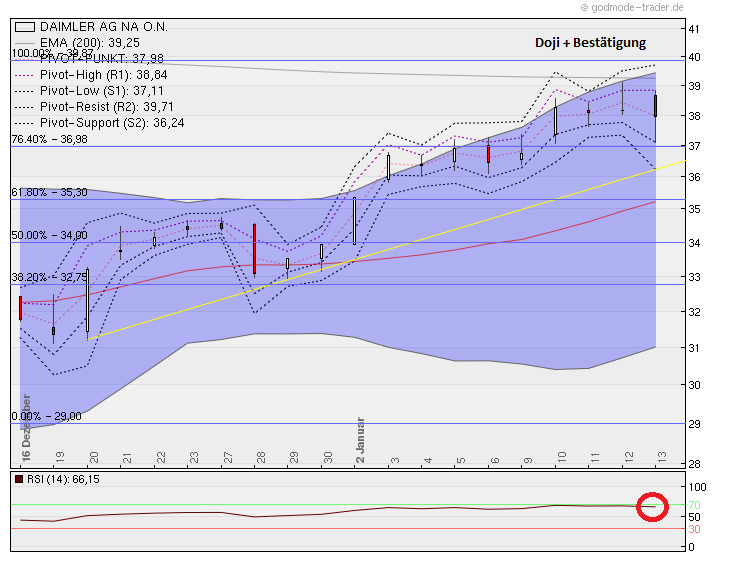 Es bedarf nur einer einzigen schlechte Woche um Daimler vom jetzigen Stand auf 33-34 zu schicken und das sollte man einfach nicht außer Acht lassen. Seit dem 19.12.2011 ging es ausschließlich bergauf und nun ist die Kehrtwende eingeleitet. Auch der Eurostoxx hat seine Ziele erreicht und ist nun zeitgleich bereit für die Korrektur. Einzig der DOW hat überhalb von 12.500 Potential bis 12.700 oder 12.800.