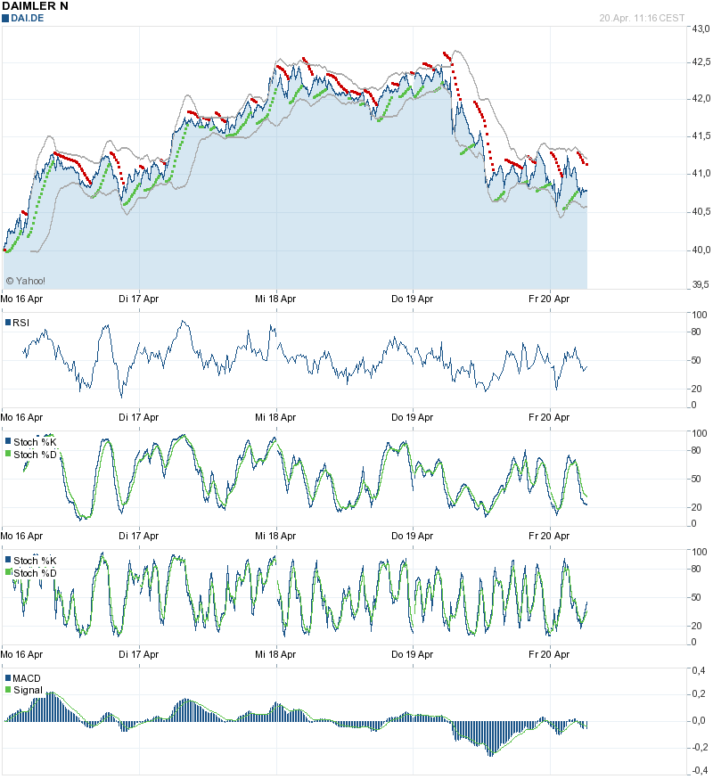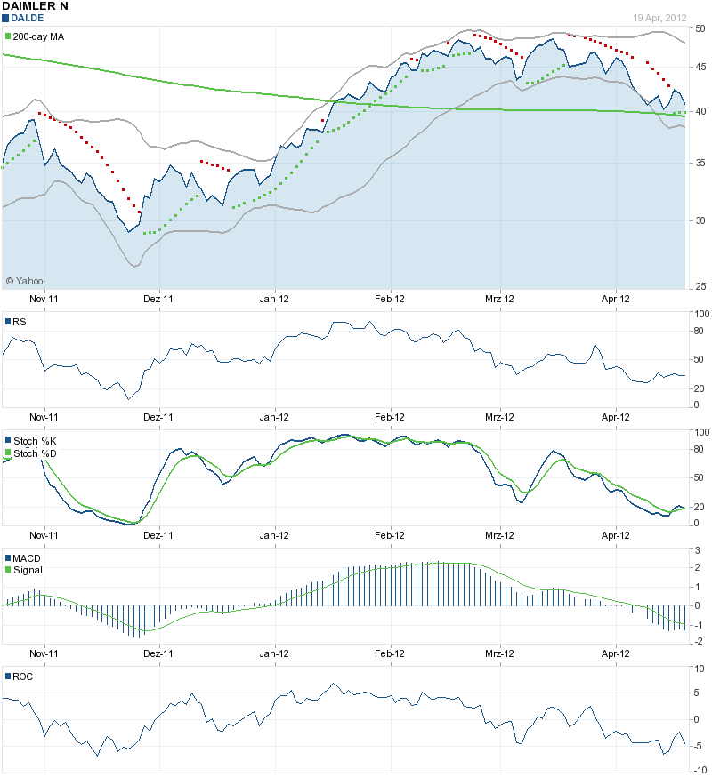 trotz bereits deutlich gefallenen Daimler-Kursen gibt unser Computerprogramm noch immer kein klares Kaufsignal, so daß wir die am 13.04. eingegangene 5. Trading-Position aus Angst gleich am Montag wieder einen Tag zu früh für 40,90 verkauft haben