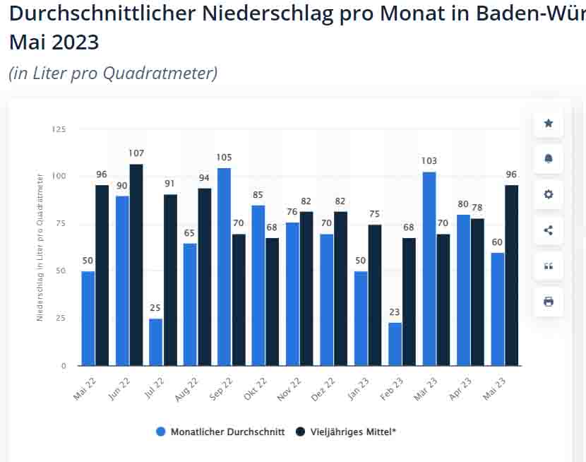 Dazu unten im Bild von statista.de der durchschnittliche Regen in Liter/m2 für Baden-Württemberg, Zeitraum Mai 2022 - Mai 2023, hellblau, für alle Monate des Jahres, gegen Vergleichswerte für die historischen Regenmengen BW 1960 - 1991 gemittelt, für alle Monate des Jahres, schwarz, jeweils in Liter / m2.
