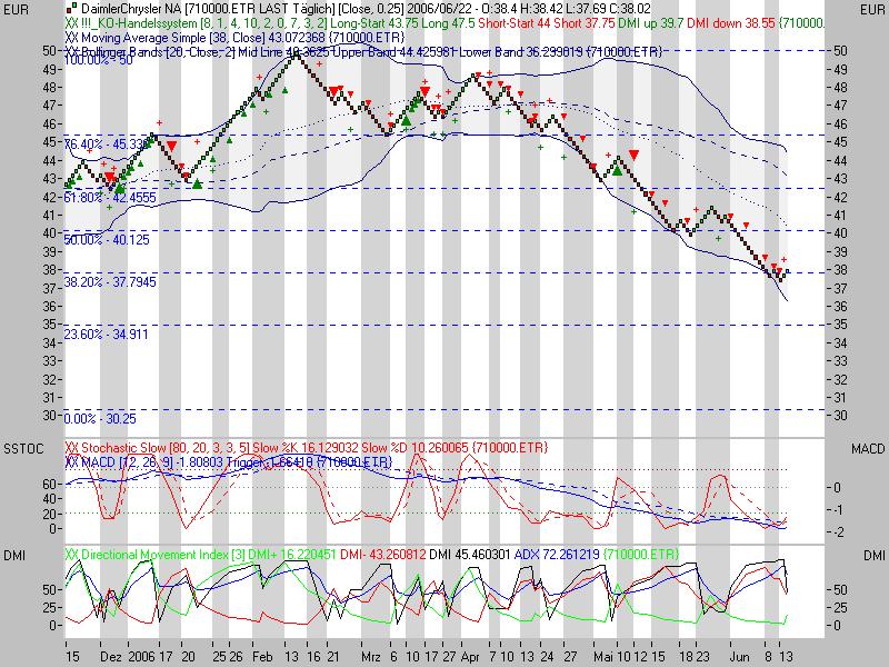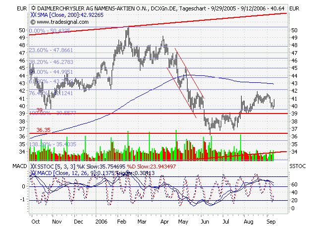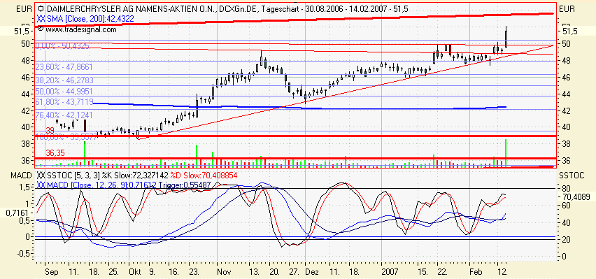 Charttechnischer Ausblick: So lange die DAIMLERCHRYSLER Aktie per Tagesschlusskurs über 44,70-45,00 Euro notiert, ist die übergeordnete Aufwärtsbewegung vollkommen intakt. Die Ziele liegen bei 50,45 und später bei 58,22 Euro. Fällt die Aktie jedoch unter 44,70 Euro per Tagesschlusskurs zurück, wären Abgaben bis 42,66 Euro zu erwarten.
