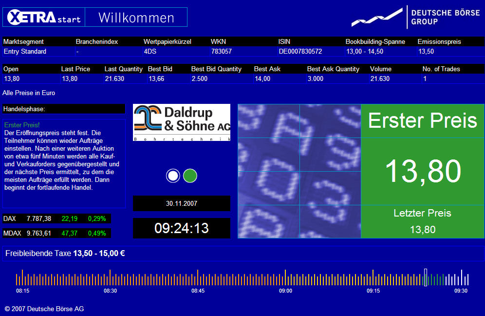 Die Daldrup & Söhne AG (ISIN DE0007830572/ WKN 783057), ein Spezialist für Bohr- und umwelttechnische Dienstleistungen, gab am Freitag bekannt, dass ihre Aktien zu einem Preis von 13,00 bis 14,50 Euro angeboten werden. Die Zeichnungsfrist läuft vom 23. bis zum 28. November 2007. Die Erstnotiz im Entry Standard der Frankfurter Wertpapierbörse ist für den 30. November 2007 geplant.