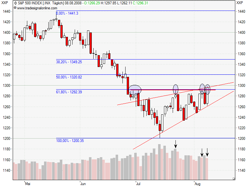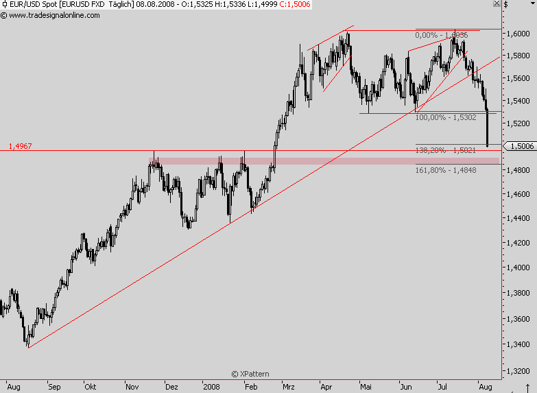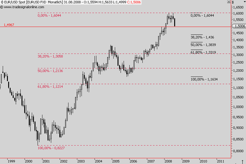 Dollar wäre für die amerikanischen Aktien mittelfristig eher schlecht: In den letzten Quartalen konnten die Ami-Firmen schöne Währungsgewinne erzielen, während auf dem Heimatmarkt Flaute herrschte. Zusätzlich wurde durch die Dollarschwäche noch ein Exportboom ausgelöst (siehe ISM-Index Export deutlich über 50). Ich sags mal so: Der Dollar hat sich kurzfristig für die Ami-Wirtschaft geopfert, der Dollar ist total abgestürzt und hat so einen Totalabsturz der US-Aktien verhindert. In Euro gerechnet notiert der Dow nur noch bei 7800 Punkten und der S&P500 bei 860 Punkten.