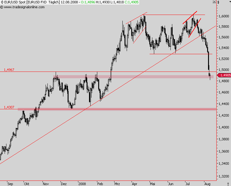 Ein nachhaltiger Rückfall unter das heutige Tief bei 1,4850 USD würde direkt weitere Abgaben bis 1,4700 - 1,4730 USD einleiten, wo dann spätestens eine Kurserholung starten sollte.
