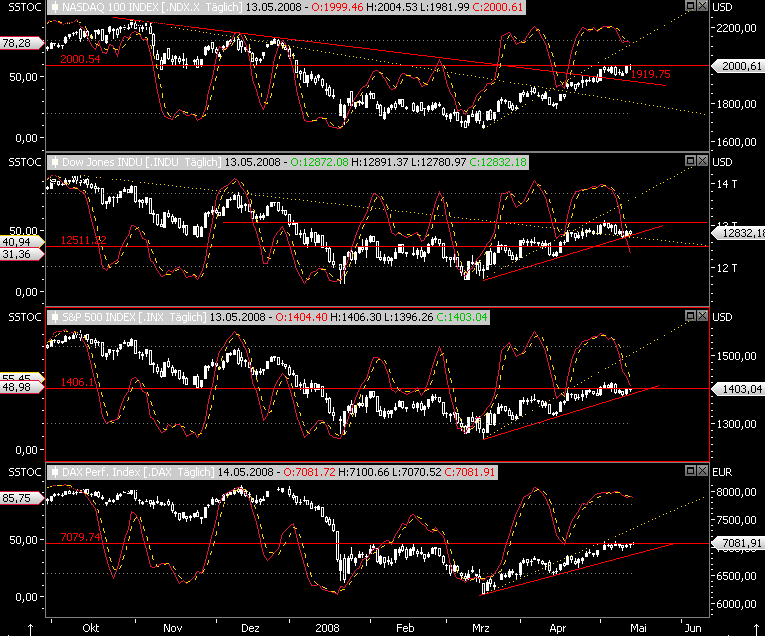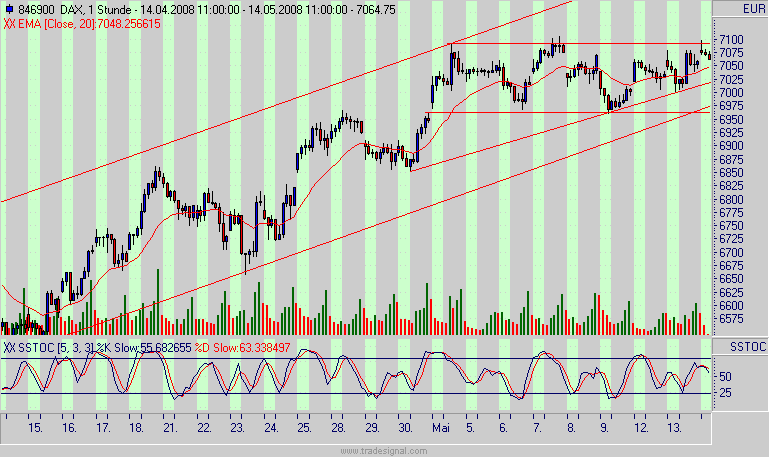 Prallt der DAX jedoch bei 7.092/7.100 nach unten ab, so kommt im Tagesverlauf eine Abwärtsbewegung bis 7.040/7.048 sowie 7.000/7.015 + 6.966/6.969 in Frage. Fällt der DAX unter 6.966, so ergibt sich ein Verkaufssignal mit Ziel 6.850.