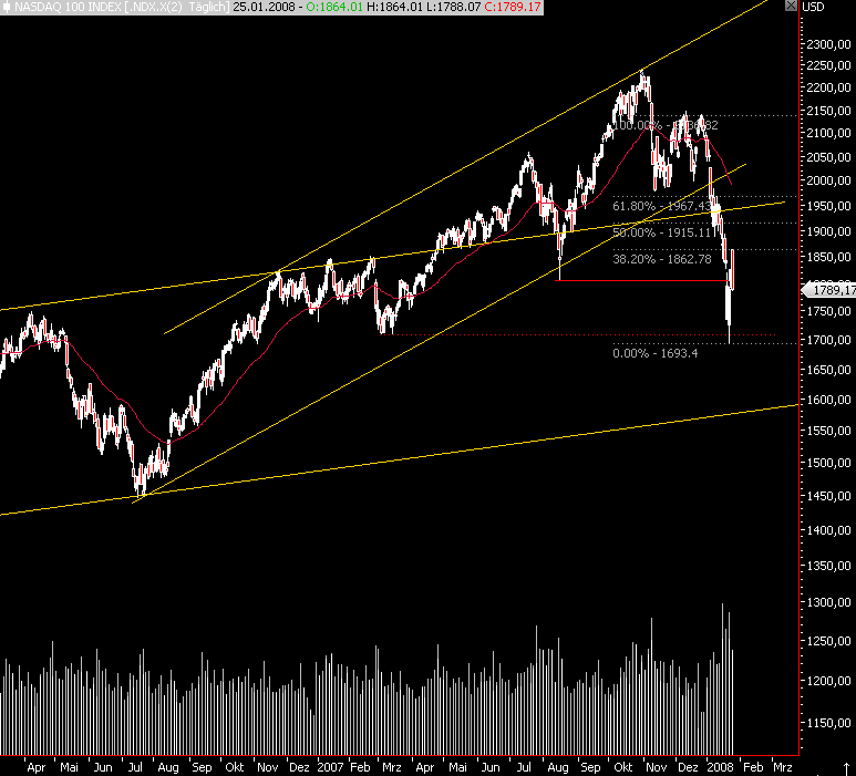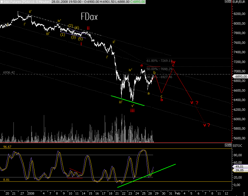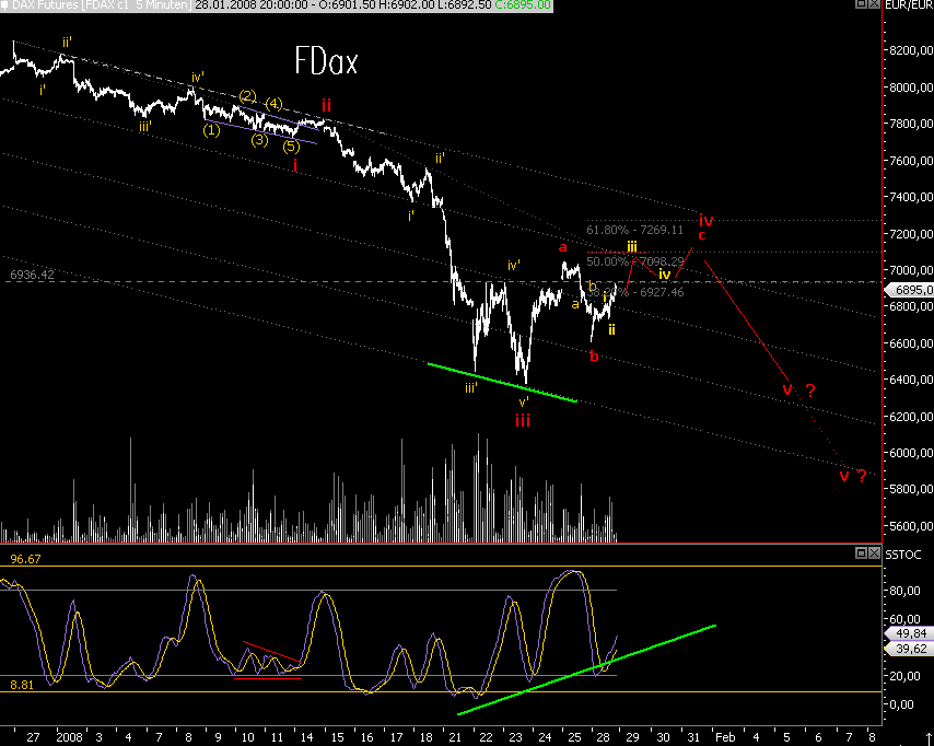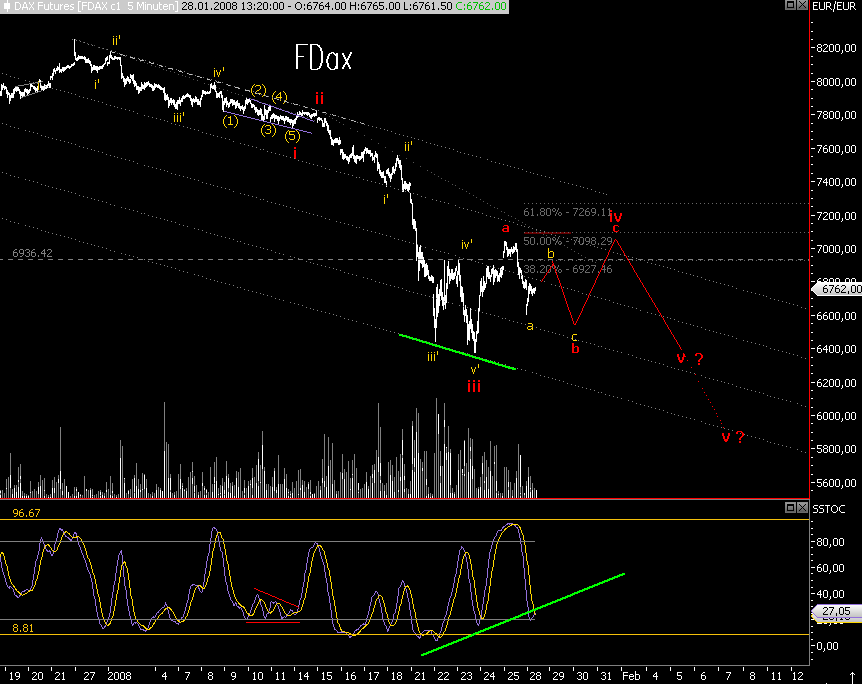 allerdings hat der FDax meiner Meinung nach seit "heutigem Tief 2 Impulse gemacht, sodaß die Frage gestellt werden muß, ob die rote b-wave nicht bereits fertig ist und wir bereits in der roten c-wave sind, kurzfristig ist der Dax zwar überkauft, allerdings gibt es in den größeren Bildern nun einige Kaufsignale, sodaß nicht ausgeschlossen werden kann, daß der Dax bereits 1/2, 1'/2'of iii(c) mit dem Top gerade abgeschlossen hat, zeitlich würde das nicht schlecht zum Window Dressing (Monatsende) passen. Ein Hoch also per 31.01. bzw. 01.02., ein signifikantes Tief dann rund eine Woche später (höheres Tief?).