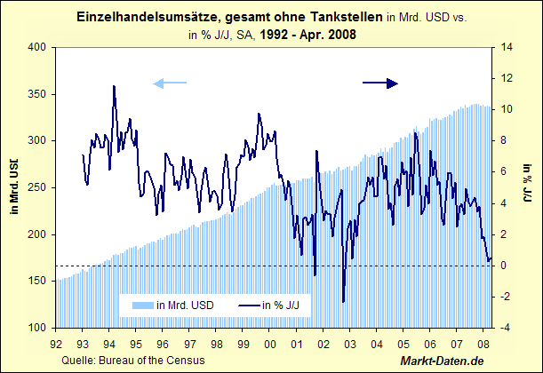 des "unzerstörbaren US-Konsumenten" ist zwar immer noch intakt, aber seit einigen Monaten wird er von der Realität vernichtet: Die nominalen Einzelhandelsumsätze außerhalb der Tankstellen (nur die machen ein Super-Geschäft bei diesen hohen Ölpreisen)schwächeln bedenklich, real sind die Umsätze im freien Fall. Wann werden die Firmen das merken, oder wird nur noch an die Chinesen verkauft?