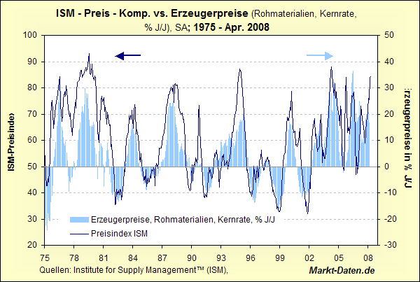 Endlich wird offiziell bestätigt: Wenn der Dollar stärker wird, dann kackt das verarbeitende Gewerbe in USA ab. Ich sehe gerade: EUR/Dollar 1,55, welch eine Tragödie, dass der Dollar nicht schwächer werden will! Preisindex bei 87, sehr hohes Niveau, falls er da nicht schnell wieder runter kommt, ist mit einer Stagflation wie Ende der 70er zu rechnen (siehe Chart).
