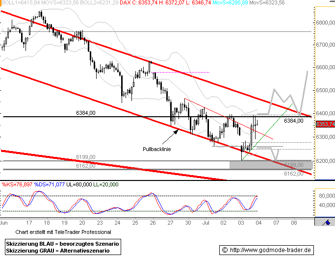 Die entscheidende Schaltstelle befindet sich bei ~6.384. Steigt der DAX mit mehr als nur einem kurzen Intraday peak über 6.384/6.396, so wäre dies ein Signal, das den Index zu höheren Zielen, wie z.B. 6.500 und 6.570 führen könnte.
