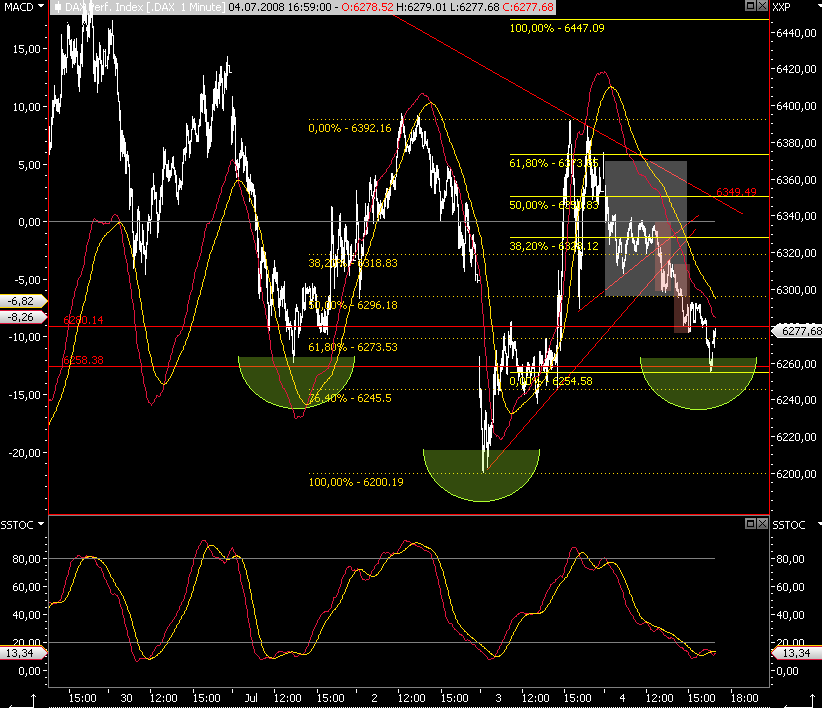 Soll mir Recht sein, heute hat es mir allerdings kein Glück gebracht. 2 mal antizyklisch auf dem falschen Fuss erwischt worden, und da ich meine Positionen grundsätzlich schliesse, habe ich die Verluste erst einmal realisiert. Mein VW-short läuft dagegen sehr zufriedenstellend, heute waren wir schon kurz unter 175 und der Schein läuft mir auch nicht mehr ins Minus; Einstieg erfolgte nach dem erfolglosen Backtest der 38T-Linie bei ca. 182 €. Ich sag schon mal schönes WE; Biergartenwetter ist in Berlin allerdings weniger, es ist trübe und regnerisch, dafür war gestern eine Backofenhitze.