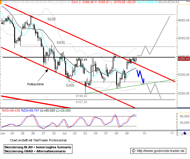 Allgemein gilt, dass sich der Index zwischen 6.260 Punkten und 6.395 Punkten in einem kurzfristig trendlosen Preisbereich befindet, in dem ständige Richtungswechsel in den Handel eingeplant werden müssen. Erst mit einem Ausbruch aus dieser Zone sollte der DAX eine neue Trendbewegung starten können.