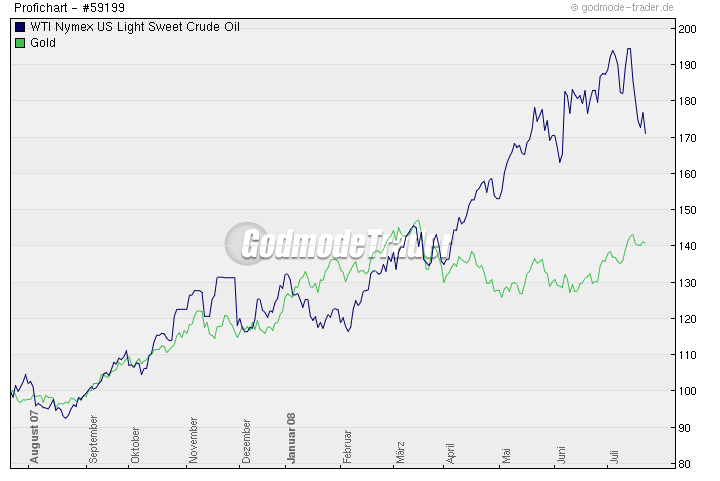 Schauen Sie sich den Vergleich der Kursverläufe beider Basiswerte an. Gold und Öl korrelieren positiv. Seit März dieses Jahres ist allerdings erkennbar, dass Gold korrigierte, der Ölpreis aber weiter haussierte.
