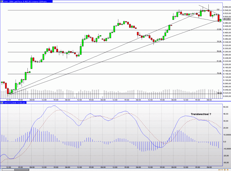 Diagnose: Im gestrigen Handelsverlauf zeigte sich der Dax voller Tatendrang: Zum einen riss er eine nicht unbeachtliche Kurslücke, zum anderen stieß er unter hoher Dynamik in seine Widerstandszone bei 6400/6500 Punkten vor und konnte dieses Niveau mit einem Schlussstand bei 6536 Zählern überzeugend halten. Exakt auf diesem Level residiert der 38-Tage-Durchschnitt, der sich noch als Spaßbremse erweisen könnte.