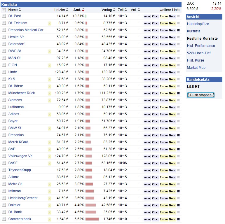 FRANKFURT (dpa-AFX) - Der Dax (DAX) hat am Dienstagnachmittag im Zuge schwächerer US-Börsen weiter nachgegeben. Zuletzt verlor der Leitindex 1,37 Prozent auf 6.682,25 Punkte, nachdem er kurz zuvor sein Tagestief bei 6.665,74 Punkten markiert hatte. Angesichts der Sorgen über die Weltwirtschaft bleibe die Erholung an den Aktienmärkten vorerst aus, hieß es von Marktbeobachtern. Zu dem schwachen US-Arbeitsmarktbericht vom Karfreitag kämen als Belastungsfaktoren die wieder stärker in den Vordergrund rückende Schuldenkrise in Europa sowie enttäuschende Wirtschaftsdaten aus China hinzu./ajx/he