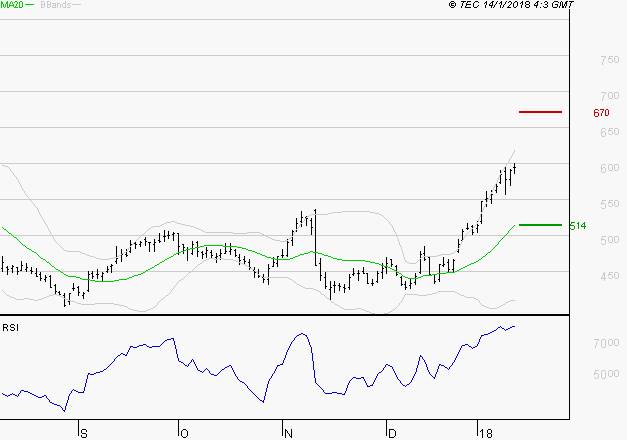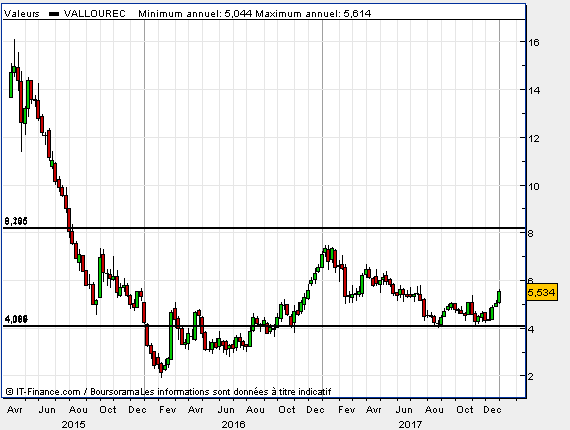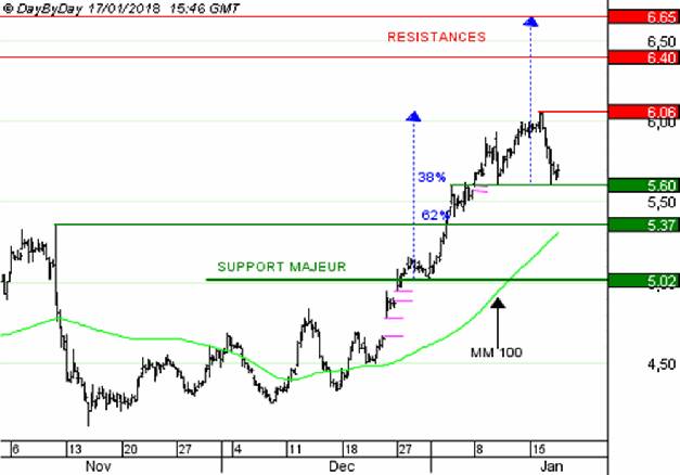 Aus grafischer Sicht endete VALLOURECs impulsive bullische Bewegung mit einem Widerstand von 6,06 EUR. Die Preise begannen sich zu konsolidieren und der letzte Tiefpunkt bis zu 5,60 EUR wurde erreicht. Gestärkt durch das Fibonacci-Verhältnis von 38% sollte der Aufwärtstrend nun wieder in Richtung 6,40 EUR und dann 6,65 EUR gehen. Der optimale Einstiegspreis für dieses Szenario liegt bei EUR 5,61 und die Ungültigkeit beträgt EUR 5,34. Analyse geschrieben am 18/01/2018 um 08:42 (18/01/2018 07: 42: 21Z) Tag für Tag - Matthieu Driol - Senior Analyst