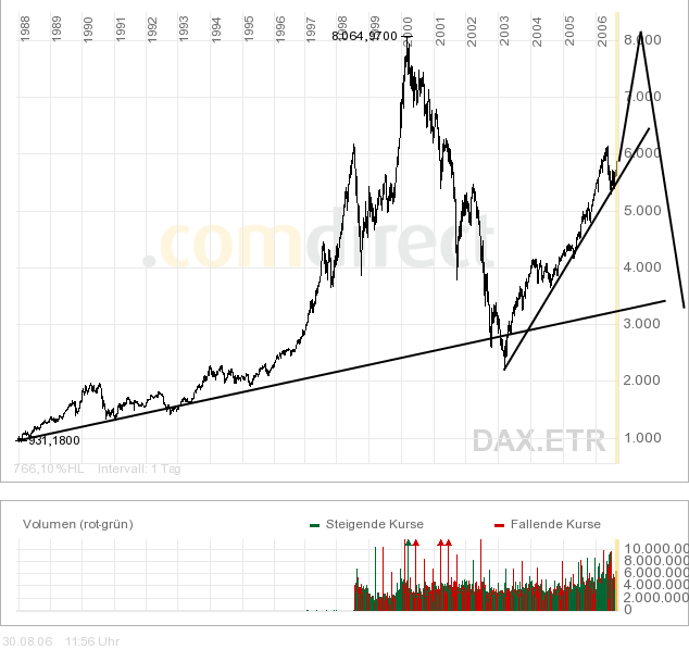 das dachte ich auch, als ich die kgv's der dax-unternehmen gesehen hab. als der dax vor wenigen jahren über 6000 sprang, waren die gewinne der AG's nicht so hochoptimiert wie es heute der fall ist, und heute ist auch kein ende eines wirtschaftsbooms zu sehen ( weltwirtschaft / exportweltmeister deutschland... ), sondern eher ein anfang. der dax steigt doch nicht ohne grund so beharrlich nach oben ( jetzt mal von den minicrashs abgesehen ) - der "denkt" ( Metamensch / Herdentrieb ) sich schon was dabei. und außer dem sind aktien eh immer danach bestrebt zu steigen. deswegen bleib ich langfristig optimistisch für aktien / dax. hab mir deshalb eine kleine pos. open end scheine gekauft und werde die auch behalten / wenn nicht diese scheine, dann aber dennoch das prinzip weiter verfolgen mit besseren hebelprodukten.