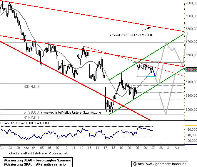 Aktuell kämpft der Dax mit dem massiven Widerstandsband, seiner am Montag durchschlagenen ehemaligen Unterstützungszone, die im Bereich etwa zwischen 6384 und 6440 anzusiedeln ist. Eine Positionierung auf Schlusskursbasis über dieser Bastion macht den Weg frei bis zum kurzfristigen Abwärtstrend, der momentan bei rund 6510 Zählern liegt. Auch kann die Vermutung noch weiter aufrechterhalten werden, dass es sich beim Montags-Rutsch um ein Fehlsignal handelte. Doch dazu sollte der Dax auf Tagesschluss seine Unterstützung bei etwa 6384 Punkten zurückerobert haben und auch in den Folgetagen nicht mehr unterschreiten. Anderenfalls kann die gestrige Aufwärtsbewegung nur als technischer Pullback, eine Gegenreaktion im intakten Abwärtstrend, gewertet werden.