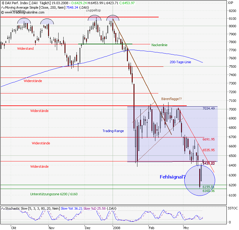 ################################################## Prognose: Gelingt die signifikante Positionierung über dem ehemaligen Unterstützungsbereich bei 6384 / 6440, so steht einer weiteren Stabilisierung und Bodenbildung im Rahmen der ehemaligen Trading-Range nichts im Wege. Doch erst ein schnelles Zurückerobern der 6650 / 6690 Punkte-Marke würde das charttechnische Bild weitgehend entschärfen und die Stabilisierungstheorie untermauern. Denn übergeordnet kann noch immer die bereits in früheren Kommentaren angesprochene Bärenflagge mit einem Kursziel bei 5800 Punkten zum Tragen kommen. In dieser Region befindet sich ebenfalls eine ausgeprägte Supportzone, die in 2006 gebildet wurde. Eine mögliche Abwärtsbewegung könnte nur vom frisch getesteten Unterstützungsbereich bei 6160 / 6200 Punkten vereitelt werden.