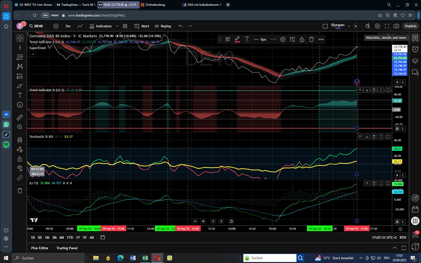 DAX oberhalb der Trend Indikator Linie - beim RSI über der 50iger Marke, somit in der bullish Zone