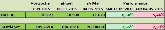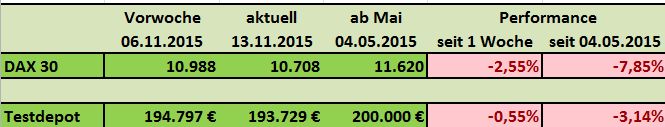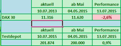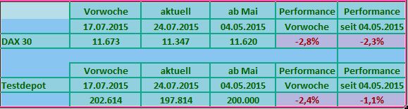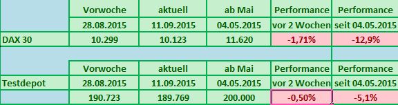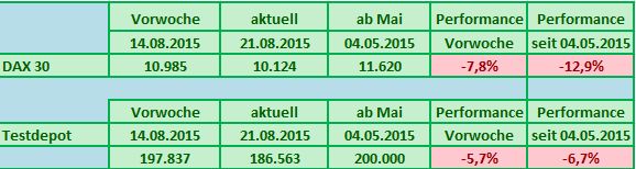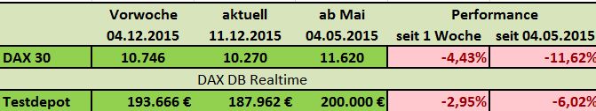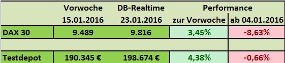 Seit Jahresbeginn verlor der deutsche Leitindex damit schon neun Prozent an Wert (XETRA-DAX), nach der DB Realtime Indikation sogar mehr als 11 Prozent. Das Testdepot konnte sich mit Minus 1,28% in Beobachtung zum DAX mit Minus 2,81% vergleichsweise gut halten.