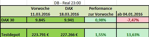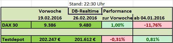 Während der DAX in der vergangenen Woche 4,7% zulegen konnte, blieb das Testdepot mit 0,25% recht bescheiden. Seit Jahresanfang hat das Depot jedoch mit 13,75% gegenüber dem DAX die Nase deutlich vorne.