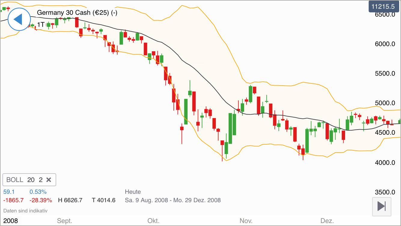 Wie sieht es nun nächste Woche aus? Die sollte nun deutlich angrünen, sofern dieses Szenario eintreten sollte. Ich möchte dazu den Oktober 2008 im Daily heranziehen (im Bärenmarkt) und ein fettes Reversal aufzeigen mit einer Handelsspanne von +1000 pkt vom Wochentief bis zum wochenhoch. Das rief lag bei 4014 pkt und innerhalb sieben Tagen (also bis in die Folgewoche) stieg der dax in der Spitze auf 5302. wir hatten ein 32% iges reversal. Kann der dax auch. Also 30% innerhalb von 7 Tagen, kann er nicht. 1000 pkt kann er schon. Somit bin ich auch positiv gestimmt, dass wir die wieder an die 12000 kommen, auch wenn wir mein optimalziel bei 10956 um 100 pkt verfehlt haben. Wird deswegen gleich die Jahresendrallye eingeläutet, ist schwierig auszumachen, denn vergleicht man den Verlauf des Oktobers 2008, war es nur eine Erholung im Bärenmarkt. Hier nochmals der Daily aus vor genau 10 Jahren.