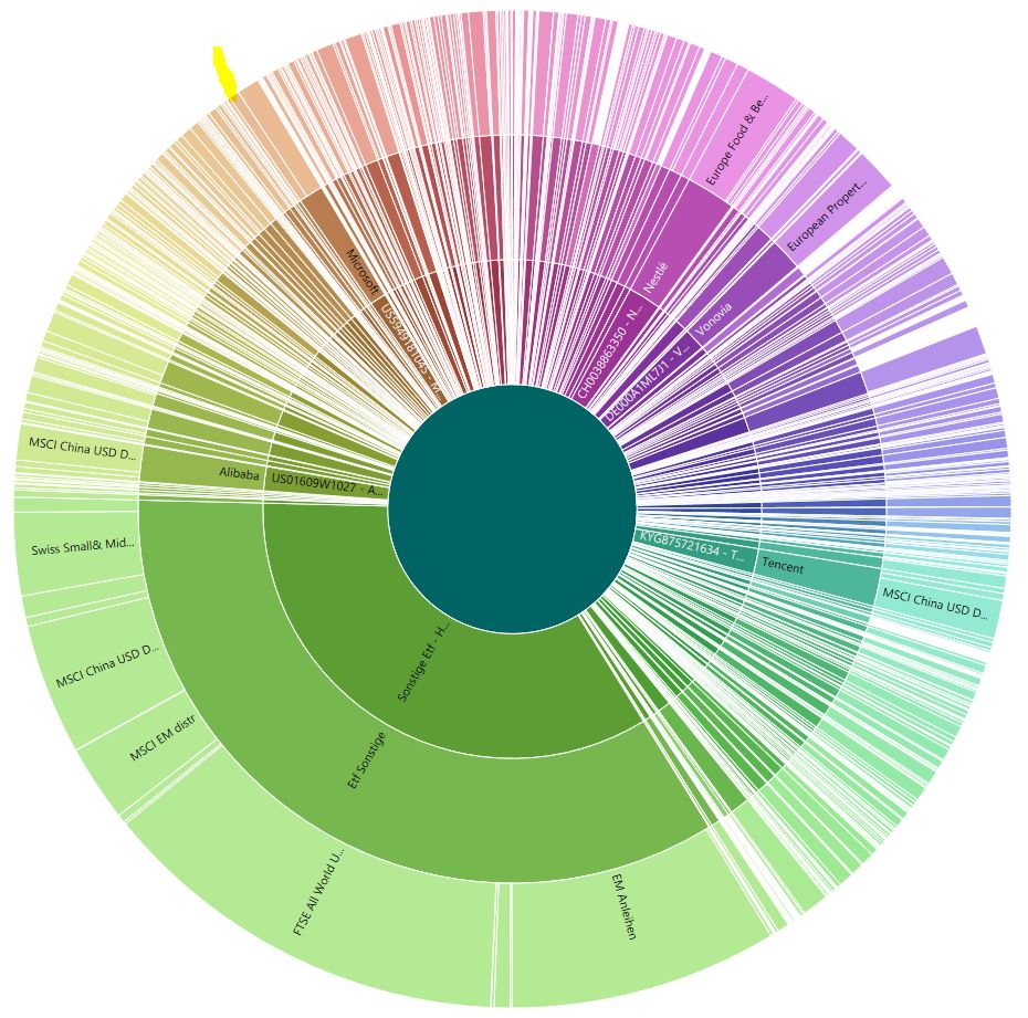 Um auch für die ETFs grafisch nachvollziehen zu können, wie ihre Portfoliogewichtungen sich bei mir im Depot auswirken, habe ich sie in Portofolio Performance entsprechend klassifiziert. Zur Zeit steckt allerdings nur etwa 1/4 meines in Wertpapiere investierten Kapitals in ETFs oder Fonds; die andere Hälfte liegt in Einzelaktien und der Rest auf dem Tagesgeldkonto.