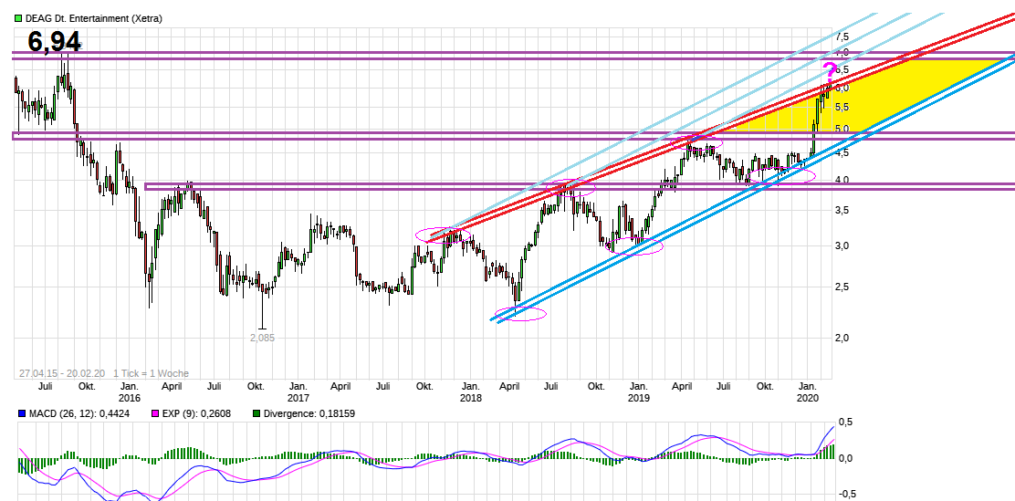 ob man es schafft aus dem seit Ende 2017 steigenden Keil nach oben auszubrechen, d.h. nicht nur wieder bis zur oben begrenzenden roten Linie zu pendeln, sondern darüber nachhaltig zu steigen. Dann gäbe es neuen Platz bis zum nächsten größeren horizontalen Widerstand im Bereich von ca. 6,94. Muß man jetzt mal abwarten. Die Zukauf-Meldung von Novogratz /Novofam im Januar hat sicherlich die Bremse unten gelöst, aber das alleine bewirkt auch noch kein endloses steigen. Weitere Stimmrechtsmeldungen gab es seitdem auch nicht mehr. Irgendwann sollte mal was an unerwarteten "Good News" zusätzlich kommen was so weiteres fundamentales Futter für höhere Kurse liefert, da die Bewertung rein auf das operative Geschäft bezogen inzwischen doch schon hoch ist und auch der MACD in deutlich überkaufte Regionen zieht. Da spekuliert man also scheinbar auf Dinge die noch nicht verkündet wurden. Willkommen wäre also jederzeit gerne eine Meldung über einen Sonderertrag im Zusammenhang mit dem Gelände der Jahrhunderthalle ( www.finanzen.net/nachricht/aktien/...e-aus-zwei-ecken-6961901 "25.12.2018 ...Fantasie verspricht zudem eine Gewinnbeteiligung am Verkauf von Grundstücken rund um die Jahrhunderthalle in Frankfurt. Deag bilanziert die Grundstücke als Bauerwartungsland, doch in den kommenden zwei Jahren könnte daraus Bauland werden.....bei erfolgreicher Entwicklung der Grundstücke ein anteiliger Verkaufserlös von gut 15 Millionen Euro zufließt und neben dem hohen Liquiditätszufluss ein außerordentlicher Gewinn von rund zehn Millionen Euro abfällt... ") oder eine Übernahmeangebot durch einen größeren Entertainment-Konzern, der ohne kartellrechtliche Schwierigkeiten zukaufen dürfte. Wobei ich die erstere Variante für die klar wahrscheinlichere Variante halte und die in diesem Jahr durchaus noch eintreffen könnte.