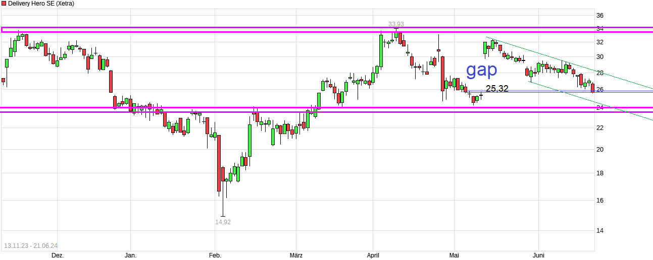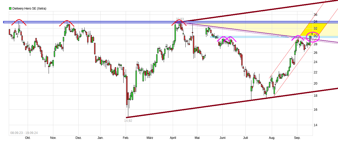 Die Aktie kommt jetzt aktuell über die Widerstandsregion 29,50/30,00 Euro raus. Wenn der Durchbruch verteidigt wird, dann wäre die nächste größere potenzielle Anlaufregion wieder der Bereich um 34 Euro. Wäre natürlich schon interessant zu wissen wann im 4.Quartal der Talabat-IPO komme soll. In wenigen Wochen fängt ja schon das 4.Quartal an. Sollte es gelingen einen IPO zu einer Bewertung über die Bühne zu bringen der im Bereich der geschätzten 5 Mrd. liegt ( www.institutional-money.com/news/maerkte/...-von-dubai-235285 "...Laut Bloomberg Intelligence wird der Unternehmenswert von Talabat auf mehr als 5,4 Milliarden Euro geschätzt. RBC Capital Markets schätzt das Geschäft von Delivery Hero im Nahen Osten und in Nordafrika auf 5 Milliarden Euro, ..") , dann wäre das sicher nochmal eine Schubfaktor für den Kurs. Parallel sieht man auch bei einem Peer wie Just Eat die letzten Tage einen weiter einen anziehenden Kurs. Vielleicht wird der Kapitalmarkt wieder etwas zuversichtlicher was derartige Lieferdienste betrifft. Ähnliches sieht man ja auch gegenwärtig bei HelloFresh.