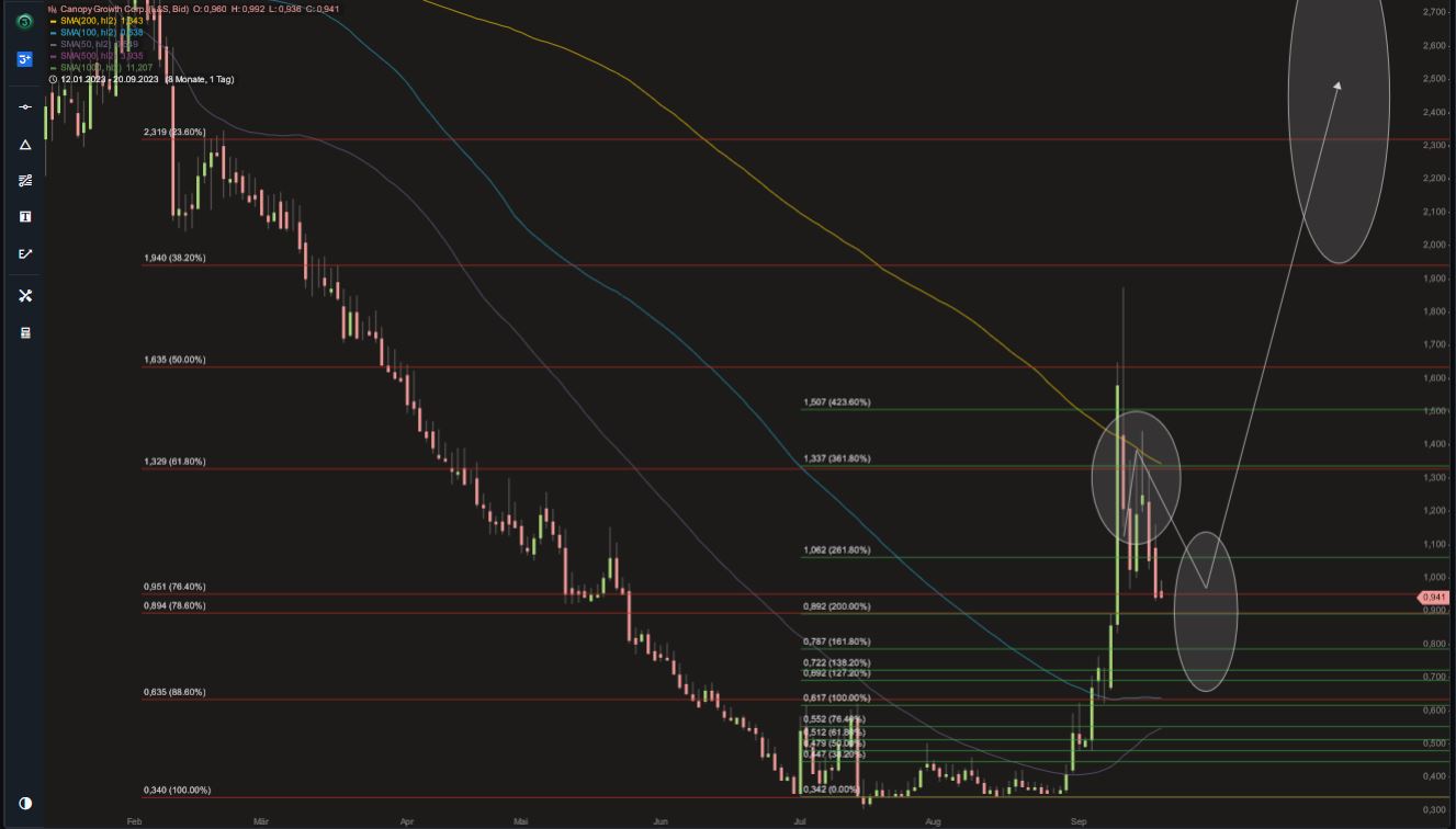 Fazit: Ein Glückwunsch an diejenigen, die bereits seit einigen Tagen oder Anfang letzter Woche in der Canopy-Aktie investiert sind. Wer den Einstieg jedoch verpasst hat, sollte es sich jetzt zweimal überlegen, ob er noch auf diesen Zug aufspringen möchte. Die Rally ist weit gelaufen und könnte zumindest kurzfristig unterbrochen werden. So trifft die Aktie im Bereich von 2,25 USD auf einen Widerstand, während man zu Unterseite bis hin zu 0,85 USD und tiefer viel Platz hätte, um zu korrigieren.