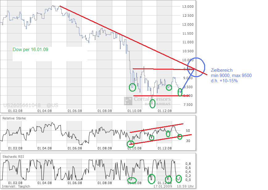 Wir befinden uns in einer übergeordneten Baisse, die Konjunkturaussichten sind schlecht. Trotzdem sind erste bullishe Divergenzen erkennbar, insbesonbdere nicht so schlecht wie erwartet ausgefallene Einzelhandelsumsätze, Lagerbestände und Frühindikatoren. Noch ist alles negativ, aber die Erwartungen scheinen evtl. zu schlecht zu sein. Die Banken sind erwartungsgemäß mit immensen Verlusten aufgeschlagen, hier ließe sich aber vermuten, dass nun das meiste auf dem Tisch liegt. Zumindest würde das für die Banken Sinn machen, um eine Rettungsschirm zu erzwingen, solange noch Geld vorhanden ist (Wer zuerst kommt mahlt zuerst). DIe Inflation ist trotz weit geöffneter Geldschleusen tot, es droht die Gefahr einer Deflation. Das Geld der Notenbank ist also noch lange nicht beim Verbrauchern angekommen.