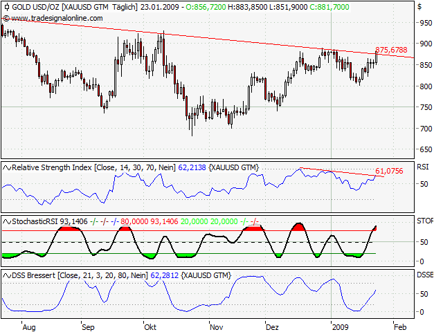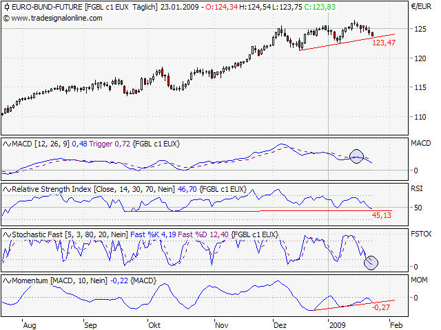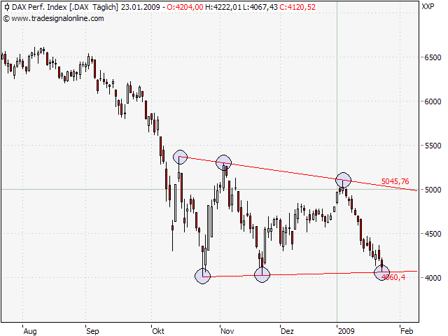 Ein baldiger Test der 4.000er-Marke scheint wahrscheinlich. Dort würde der Abverkauf auf eine erste Unterstützung treffen, resultierend aus den markanten Tiefs vom Oktober und November 2008. Ein Bruch der 4.000er-Marke würde dagegen die Schleusen für eine umfassende Korrekturausdehnung öffnen.